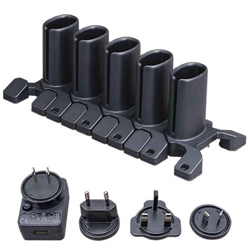 - Base de carga modular USB-C, permite conectar hasta 5 detectores en cadena.