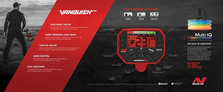 Vanquish 540 Premium Pack: detector con Multi-IQ, 25 niveles de discriminación, control Iron Bias, balance automático y versión más básica con solo una bobina y sin audífonos.
